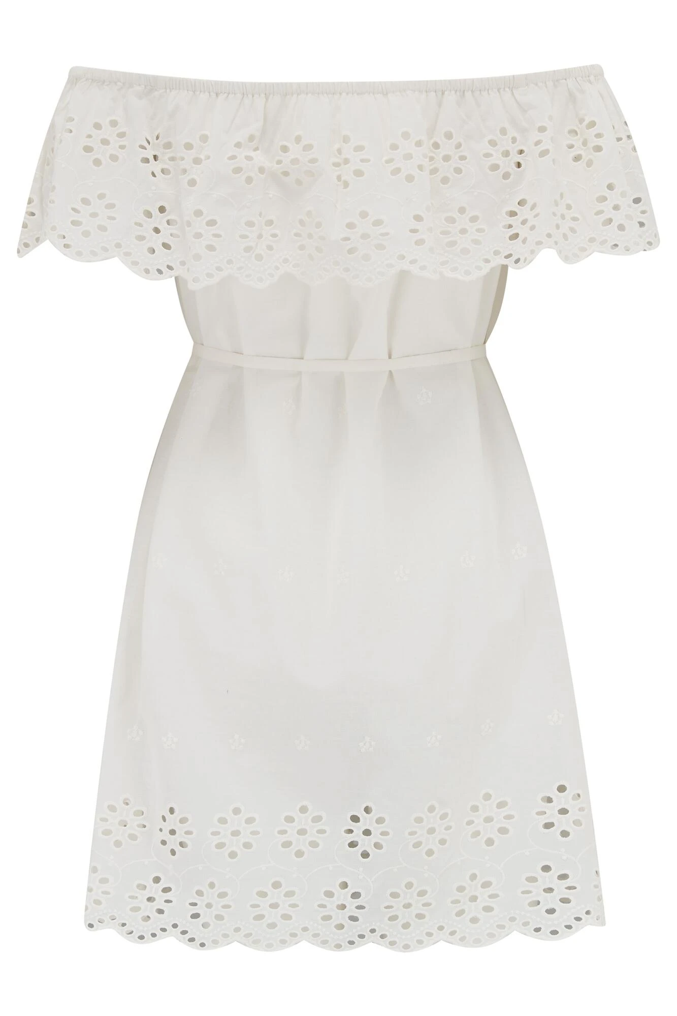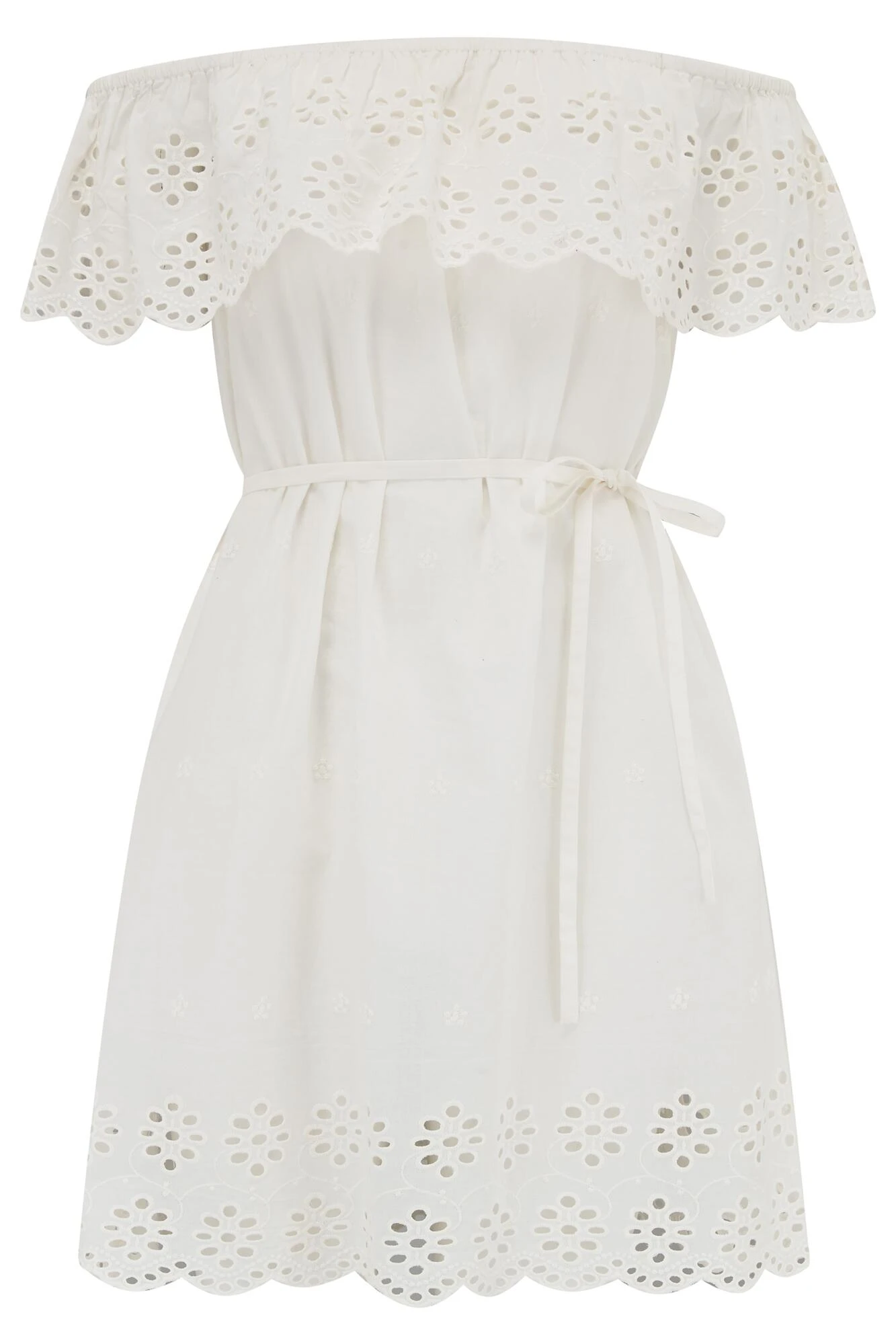 Is there anything more that screams summer than broderie! This feminine and playful fabric makes for the perfect summertime dress. In a beautiful bardot style this beach dress is adorned in flirty broderie cotton fabric that will help keep you cool and looking fabulous all summer long. With an elasticated neckline with frill detailing and a removable belt there’s no doubt you’ll feel comfortable and stylish wherever the day or night takes you!