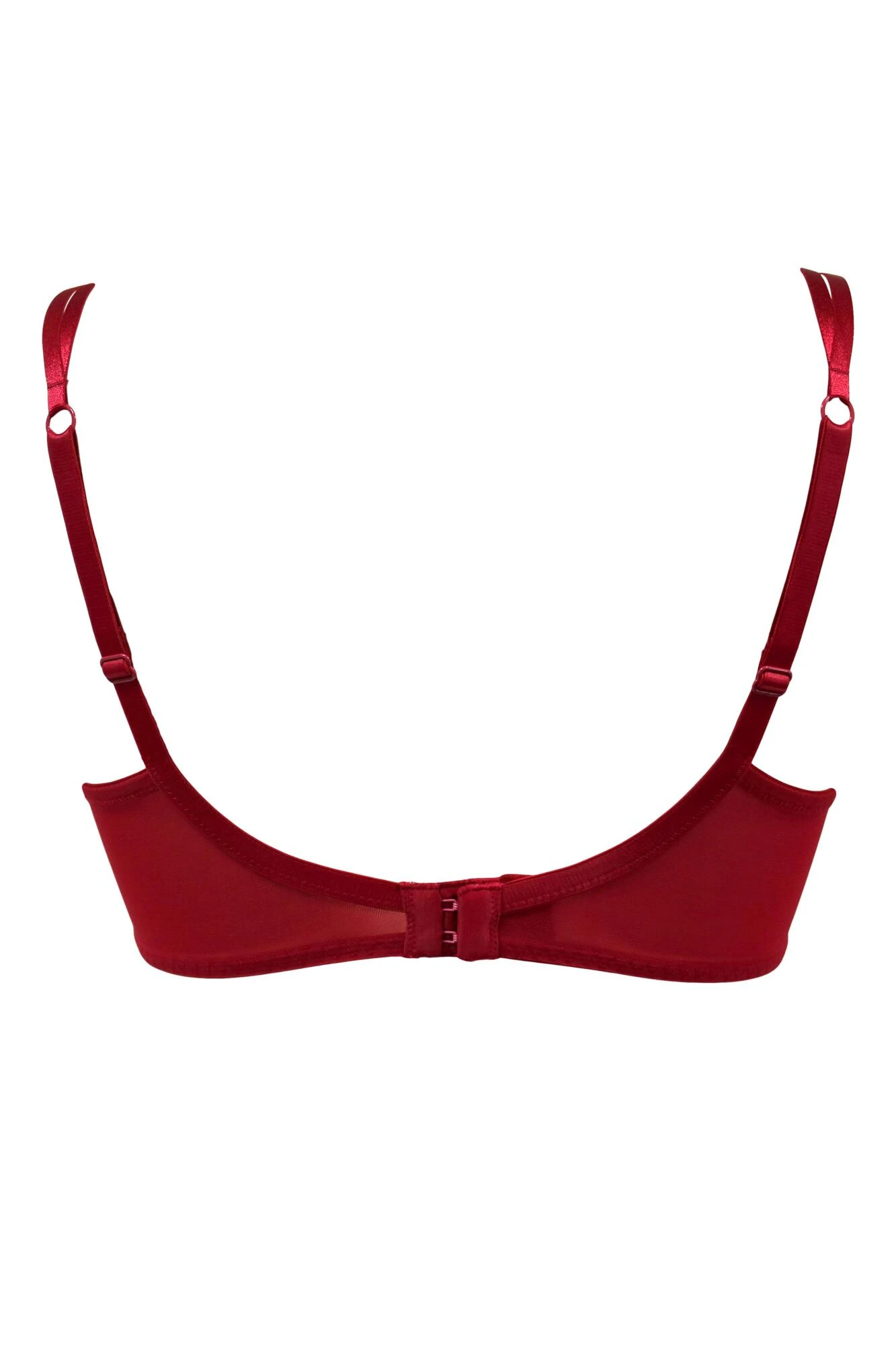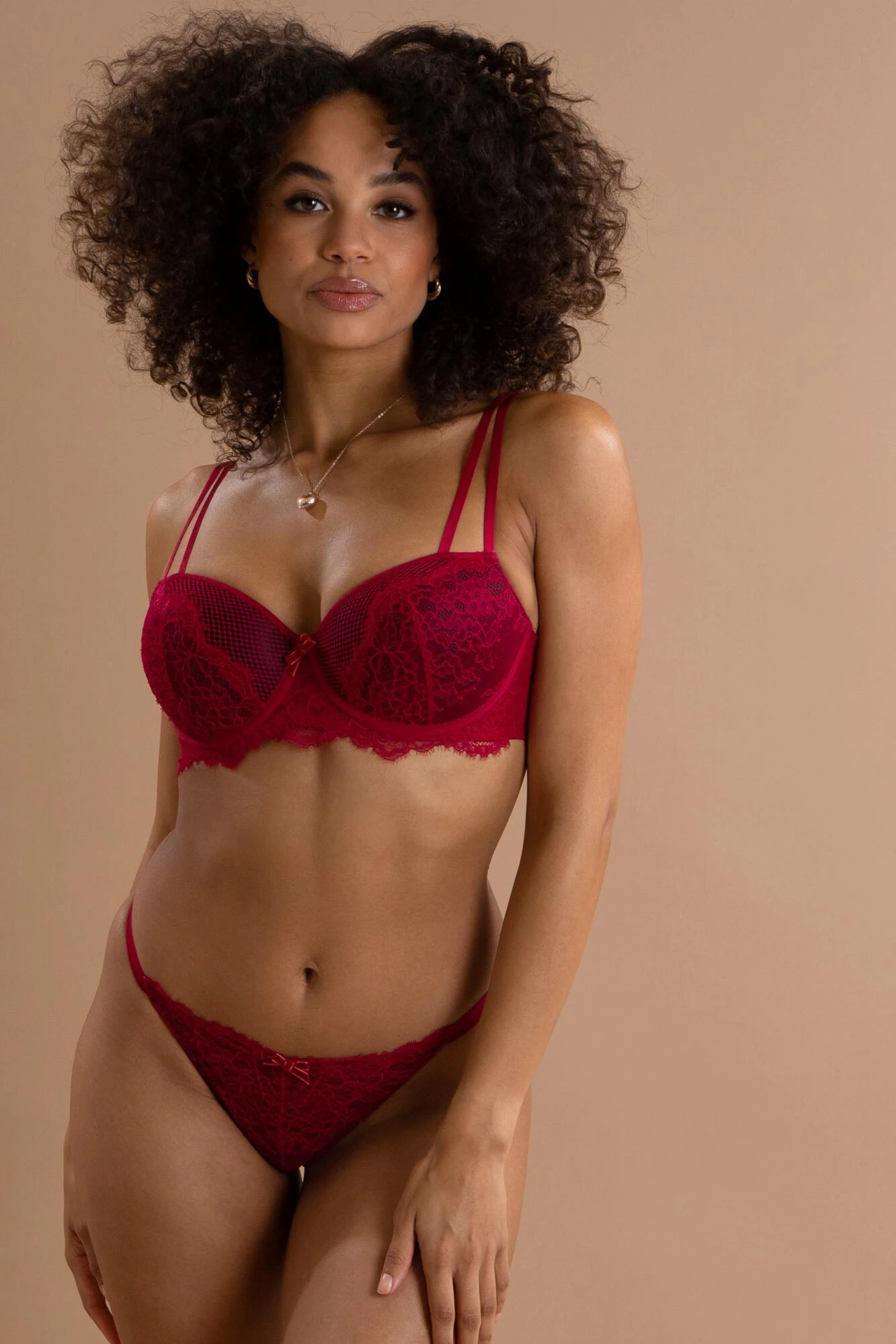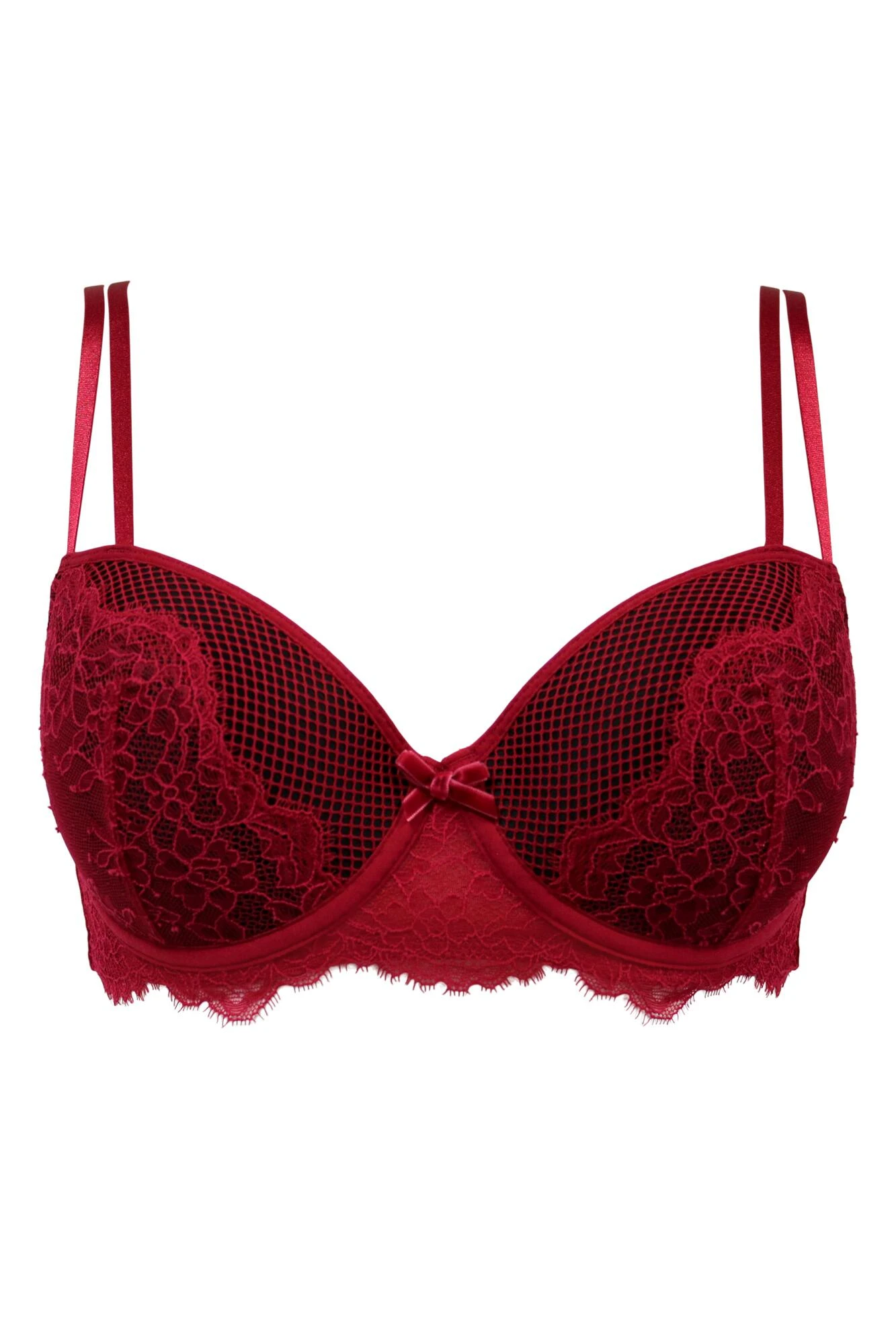 Feel irresistible in this seriously sexy padded underwired bra with caged strap detail. Made with a mix of fishnet and delicate scalloped eyelash lace for a daring and feminine look. Go for a sexy set and pair with matching underwear from the Dark Romance collection for the ultimate romantic look.