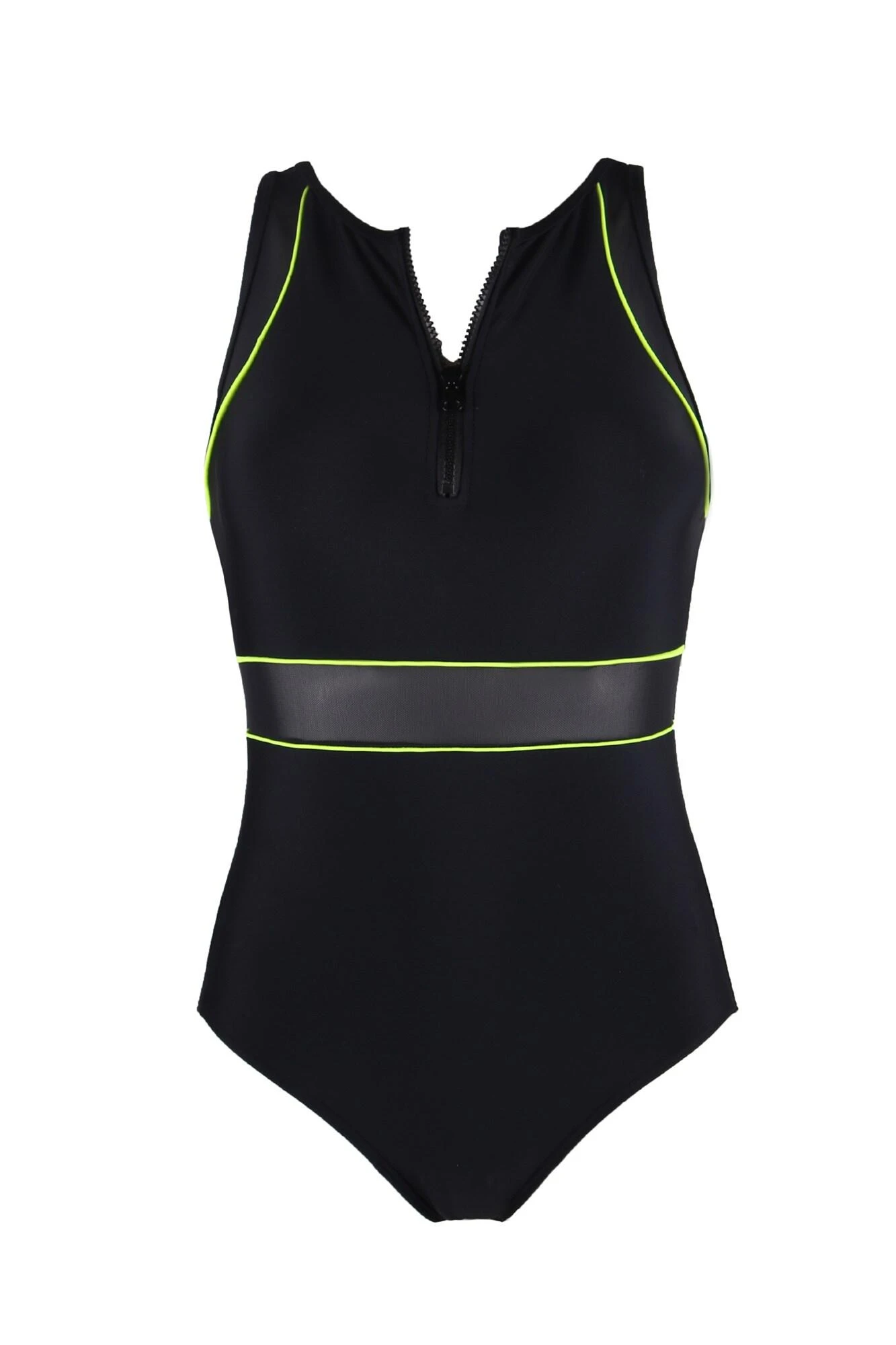 Enhance your swimwear style with our new Energy Chlorine Resistant High Neck Zip Front Swimsuit. Featuring chlorine resistant fabric, this swimsuit will shape and control your curves with its elasticated secret support and tummy control panel. This new sports suit is made from extra life lycra that lasts twice as long as standard swimwear fabric. Featuring a zip front opening at the neckline, this sports luxe style features neon piping and mesh panels for a fashion-forward look. And with a control tummy panel, this style will help to streamline you if you’re an active swimmer or ideal for your everyday lengths at the pool.