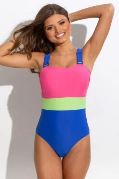 Looking to add some colour to your swimwear collection? Make sure the Palm Springs Colour Block Tummy Control Swimsuit is packed in your suitcase on your next getaway. With wide, padded adjustable straps this stunning swimsuit offers plenty of supportive and flattering features such as the on-trend buckle belt. If that wasn’t supportive enough this colour block swimsuit features a tummy control panel to shape your beautiful and natural figure. Feel fabulous as you hit the pool in this non-wired, lightly padded swimsuit. We take the impact that our business has on the planet seriously, that is why the Palm Springs Colour Block Tummy Control Swimsuit is made from recycled materials