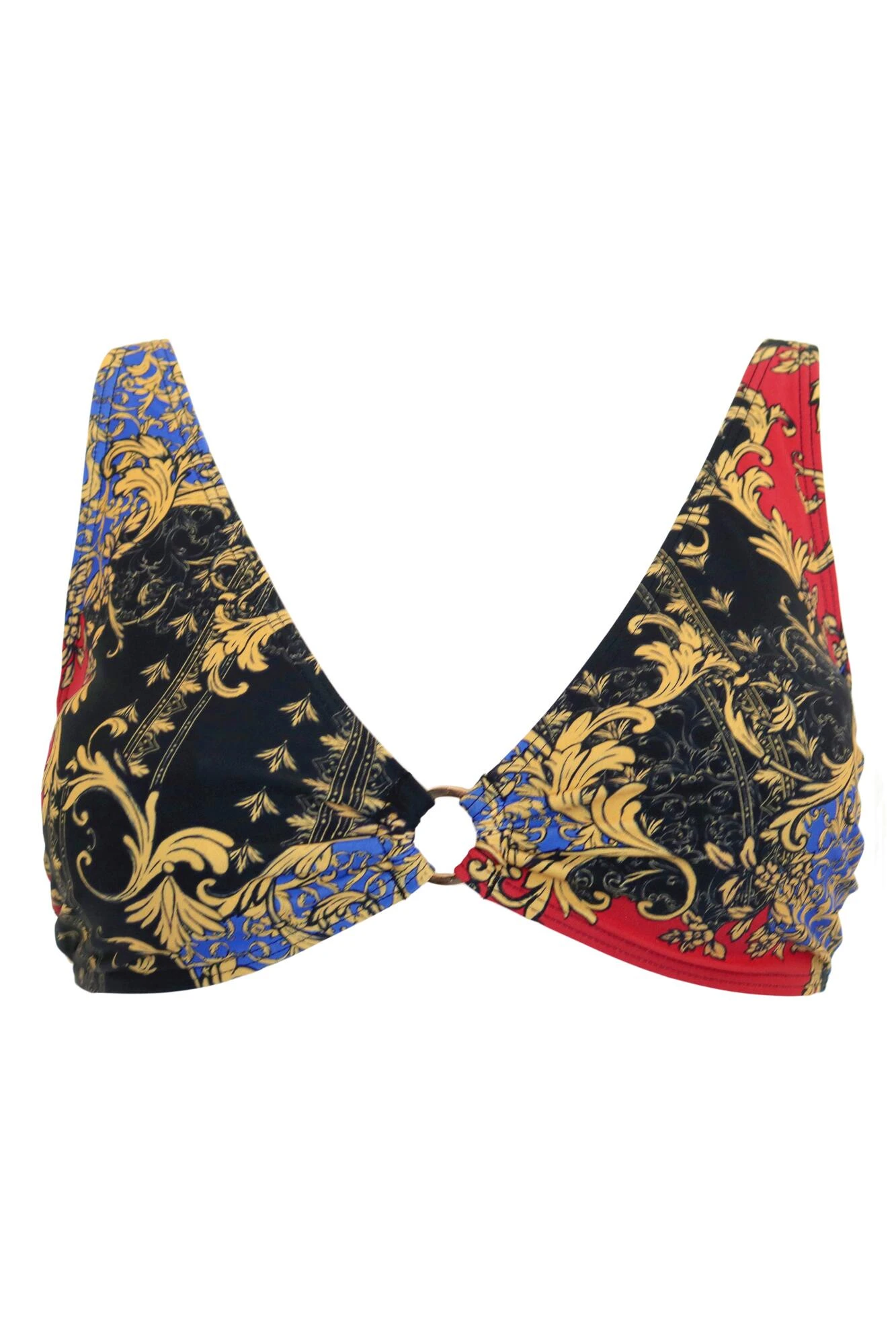 When the beach is calling slip into this Riviera bikini top. Stand out from the crowd in this triangle non wired style with removable cups. Featuring a double halter top and gold ring centre detail, it will look great on your next getaway. Match with our Riviera bottoms for the ultimate holiday look.