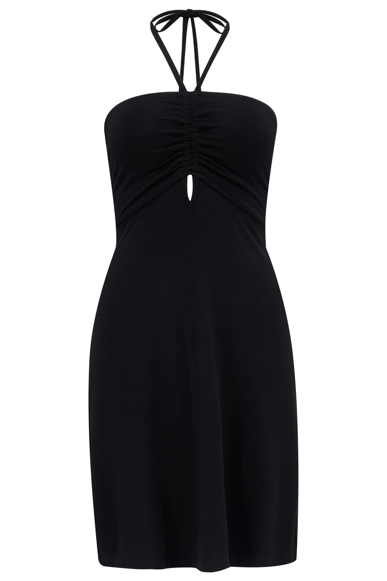 Wear the Strappy Halter Neck Mini Dress how you want. Designed in a stylish halter neck which can also be changed into a strapless style, this beach dress is summer staple. With a keyhole cut out centre front and adjustable ruched bust details this stylish mini dress in breathable jersey fabric is versatile, flattering and will answer all your beachwear needs.